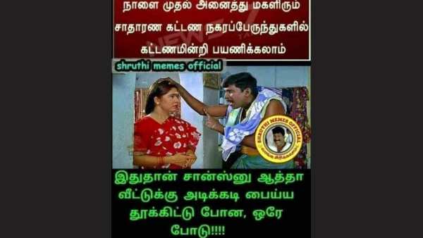 சென்னை: தமிழகத்தில் பெண்களுக்கு நகர பேருந்துகளில் இலவசம் என அறிவிக்கப்பட்டவுடன் சமூகவலைதளங்களில் மீம்ஸ்கள் தெறிக்கவிடுகின்றன.
