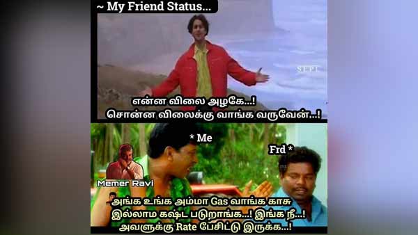 என்ன விலை அழகே.. சொன்ன விலைக்கு வாங்க வருவேன்.. என காதலர் தினம் படத்தில் இருந்து குணால் நடனம் ஆடும் பாடல் ஒளிக்கிறது. அதை வைத்தும் ஒரு வலைஞர் காமெடி செய்துள்ளார். அவரது மீமில் அங்க உங்க அம்மா கேஸ் வாங்க காசு இல்லாம கஷ்டப்படுறாங்க.. இங்க நீ.. அவளுக்கு ரேட் பேசிட்டு இருக்க என்கிறார் இவர்.