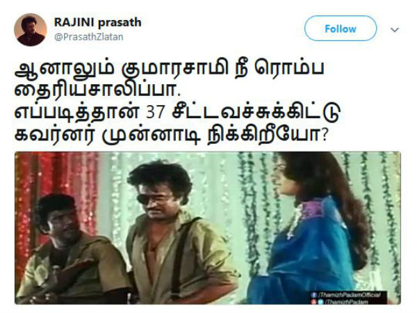 ஆனாலும் குமாரசாமி நீ ரொம்ப தைரியசாலிப்பா. எப்படித்தான் 37 சீட்டவச்சுக்கிட்டு கவர்னர் முன்னாடி நிக்கிறீயோ? என்கிறது இந்த மீம். ஆனால் 38 எம்எல்ஏக்கள் என்பதே சரி.