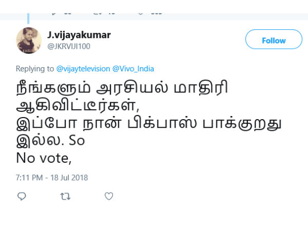 இப்போ நான் பிக்பாஸ் பாக்குறது இல்ல. அதனால் ஓட்டு போடுறதில்லை.