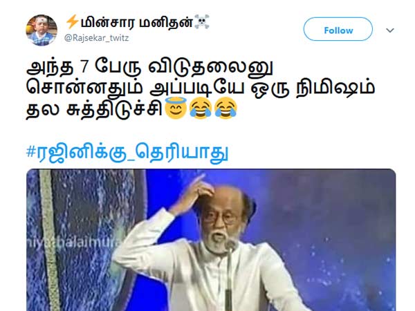 இவர் ''ரஜினி நவ்: நான் பாட்டுக்கு சிவனேன்னுதான்யா ஏர்போர்ட்ல போயிக்கிட்டு இருந்தேன், அந்த 7 பேர்னு பத்தி கேட்டு, என்னோட அரசியல் அறிவை வெட்ட வெளிச்சமாக்கி ஏழரைய இழுத்து விட்டிங்களேய்யா 😥'' என்றுள்ளார்.