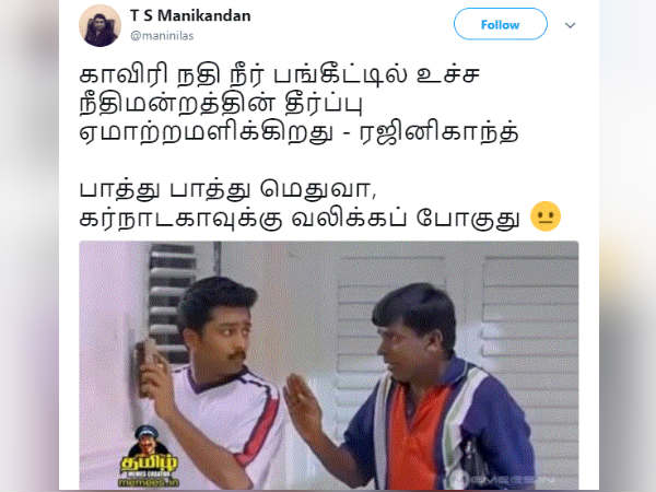 காவிரி வழக்கில் உச்சநீதிமன்றத்தின் தீர்ப்பு குறித்து நடிகர் ரஜினிகாந்த் கருத்து தொடர்பாக நெட்டிசன்கள் கிண்டலடித்து வருகின்றனர்.