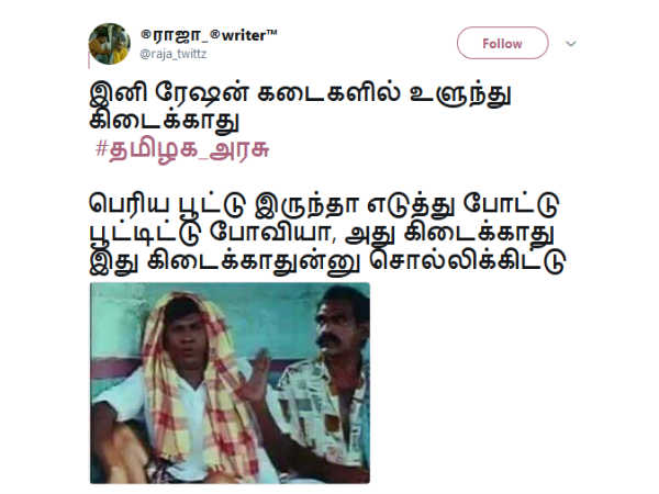 ரேசன்ல இனி உளுந்து இல்லன்னதுக்காகவே பொங்குறாங்க... நாளைக்கு ரேசனே இல்லாம போகபோவுதே அதுக்கு என்ன பண்ணப்போறீங்க...? என கேட்கிறது இந்த டிவிட்