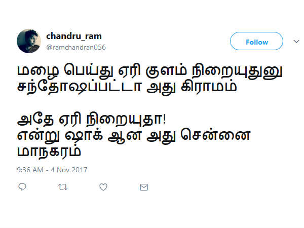 அதே ஏரி நிறையுதா! என்று ஷாக் ஆனால் அது சென்னை மாநகரம்... என கலாய்க்கிறது இந்த டிவிட்
