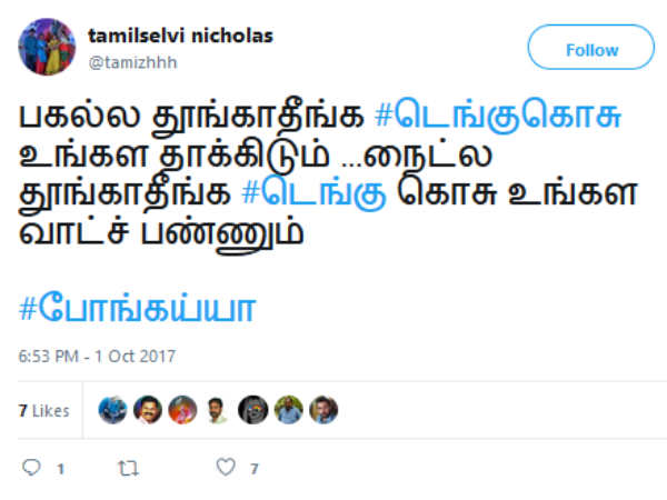 பகல்ல தூங்காதீங்க #டெங்குகொசு உங்கள தாக்கிடும் ...நைட்ல தூங்காதீங்க #டெங்கு கொசு உங்கள வாட்ச் பண்ணும் #போங்கய்யா என்கிறார் இந்த வலைஞர்