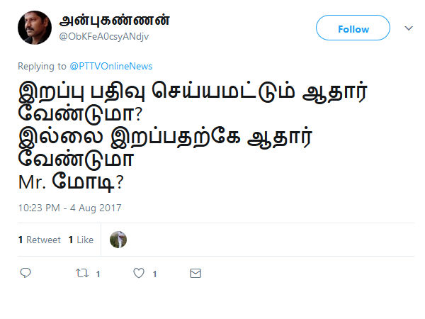 இறப்பு பதிவு செய்யமட்டும் ஆதார் வேண்டுமா? இல்லை இறப்பதற்கே ஆதார் வேண்டுமா? என கேட்கிறது இந்த டிவிட்