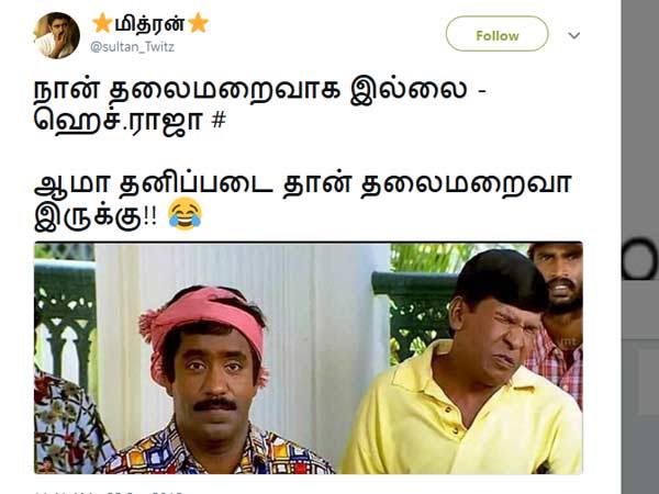 சென்னை: தன்னை கைது செய்ய தனிப்படை அமைக்கப்பட்டது குறித்து தனக்கு தெரியாது என்று எச் ராஜா கூறியதை நெட்டிசன்கள் மரண கலாய் கலாய்த்து வருகின்றனர்.