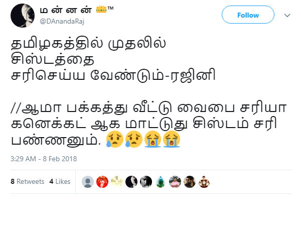 சிஸ்டம் சரியில்லை என்றால் இந்தியாவிலா அல்லது தமிழகத்திலா என்று செய்தியாளர்கள் கேட்டதற்கு அவர் இவ்வாறு கூறியுள்ளார். இதனை வைத்து டிவிட்ஸ்களை பறக்கவிட்டு வருகின்றனர் நெட்டிசன்கள்.