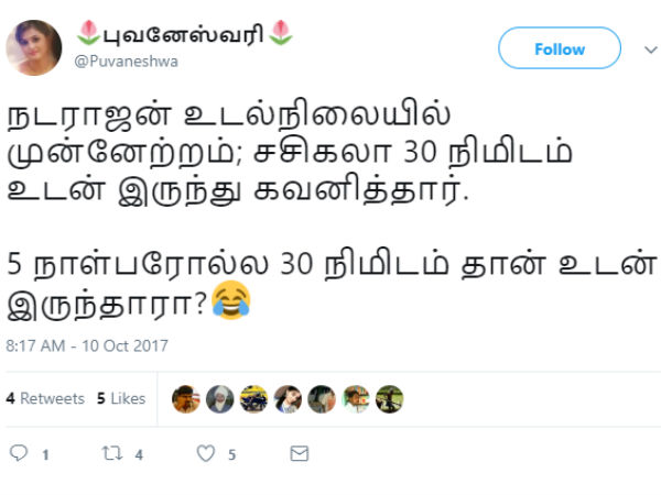 நடராஜன் உடல்நிலையில் முன்னேற்றம்; சசிகலா 30 நிமிடம் உடன் இருந்து கவனித்தார். 5 நாள்பரோல்ல 30 நிமிடம் தான் உடன் இருந்தாரா? என கேட்கிறார் இந்த நெட்டிசன்