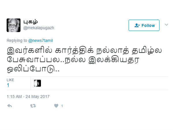 இவர்களில் கார்த்திக் நல்லாத் தமிழ்ல பேசுவாப்ல..நல்ல இலக்கியதர ஒலிப்போடு.. என கிண்டலடிக்கிறார் இந்த வலைஞர்