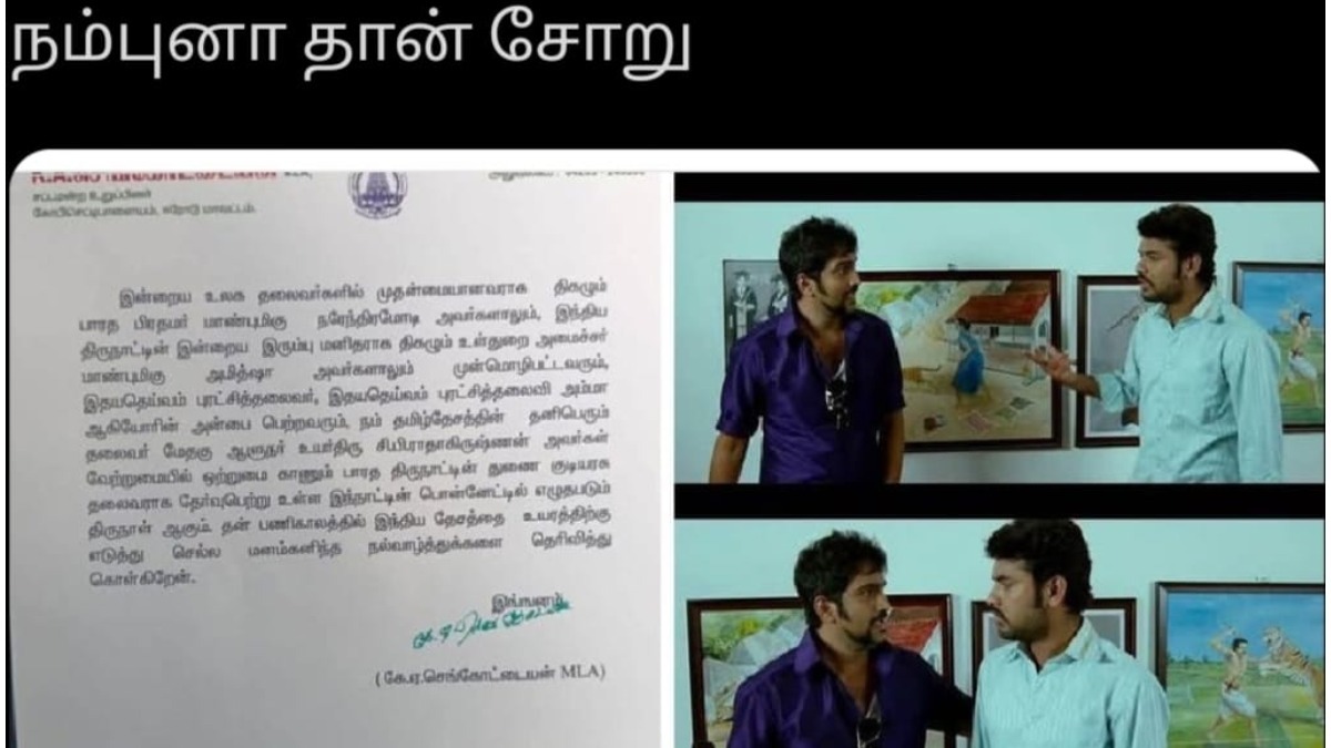 இதற்கு கலகலப்பு திரைப்படத்தில் நடிகர் விமலிடம், நடிகர் சந்தானம் ஒரு காட்சியில் நடித்திருப்பார்கள். அப்போது சந்தானம், தனது குடும்ப வரலாற்றை கூறுவார். அதை கேட்கும் விமல், ‛‛இதெல்லாம் நம்புற மாதிரியா இருக்கு'' என கேள்வி கேட்பார். அதற்கு சந்தானம், ‛‛நானும் ஆரம்பத்துல நம்பல.. நம்புனா தான் சோறு போடுவேனு தாத்தா சொல்லிட்டாரு. அதனால் நம்பிட்டேன்'' என்பார். அந்த வகையில் செங்கோட்டையனின் இந்த அறிக்கையை சிலர் மீமாக்கி உள்ளனர்.