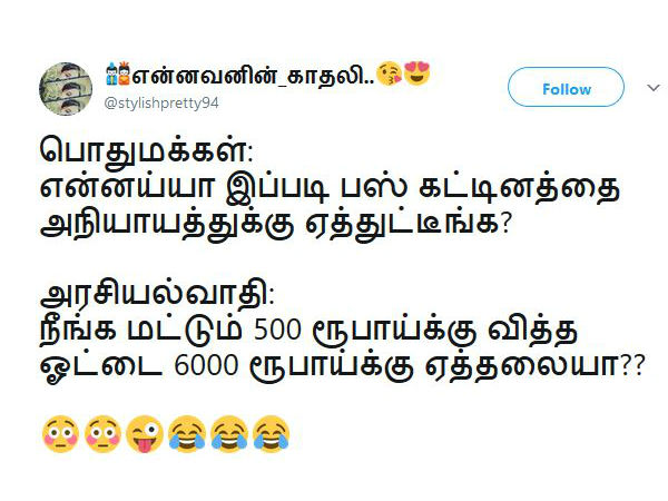 இந்நிலையில் பேருந்து கட்டண உயர்வு குறித்து சமூக வலைதளங்களில் ஏராளமான கருத்துகள் பகீரப்பட்டு வருகின்றன. அவற்றில் சில..