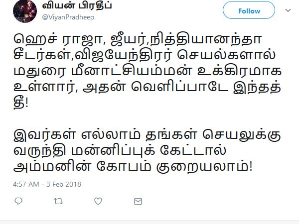 ஹெச் ராஜா, ஜீயர்,நித்தியானந்தா சீடர்கள்,விஜயேந்திரர் செயல்களால் மதுரை மீனாட்சியம்மன் உக்கிரமாக உள்ளார், அதன் வெளிப்பாடே இந்தத் தீ!