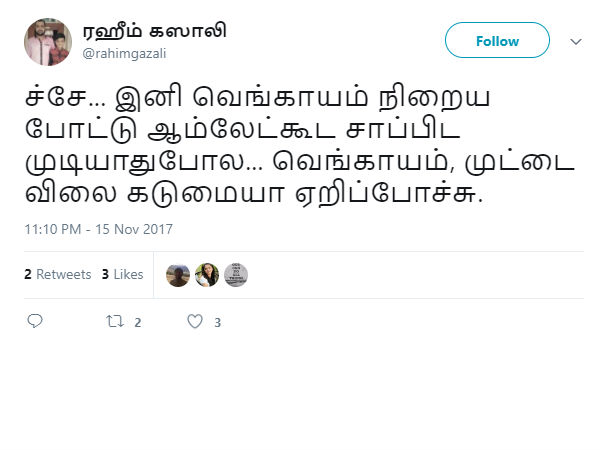 ச்சே... இனி வெங்காயம் நிறைய போட்டு ஆம்லேட்கூட சாப்பிட முடியாதுபோல... வெங்காயம், முட்டை விலை கடுமையா ஏறிப்போச்சு.. என வருத்தப்படுகிறார் இவர்..