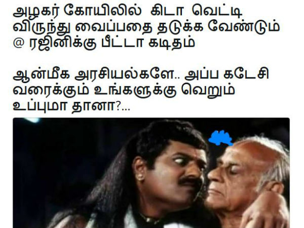 அழகர் கோயிலில் கிடா வெட்டி விருந்து வைப்பதை தடுக்க வேண்டும் என ரஜினிக்கு பீட்டா கடிதம் எழுதியுள்ளது. ஆன்மீக அரசியல்களே.. அப்ப கடேசி வரைக்கும் உங்களுக்கு வெறும் உப்புமா தானா?.. என்று கேட்டுள்ளார் இந்த நெட்டிசன்.