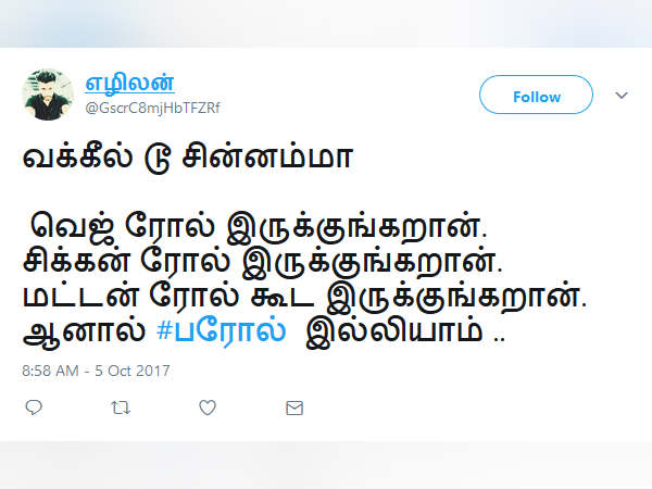 வெஜ் ரோல் இருக்குங்கறான். சிக்கன் ரோல் இருக்குங்கறான். மட்டன் ரோல் கூட இருக்குங்கறான். ஆனால் #பரோல் இல்லியாம். சிறையில் சசிகலாவை பார்த்து வக்கீல் சொல்வது போல பதிவிட்டுள்ளார் ஒரு வலைஞர்.