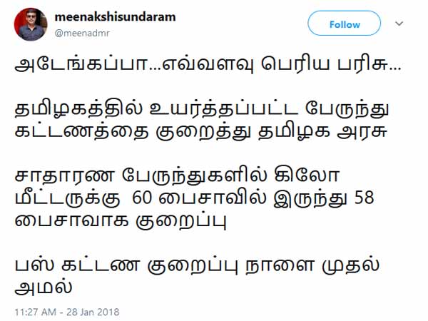 தமிழக அரசு கண்துடைப்பு நாடகம் பஸ் கட்டணம் ஏற்றியது ருபாய் கணக்கில் குறைப்பு பைசா கணக்கில் என்ன ஏமாற்று வேலை. கட்டணம் குறையும் என்ற காலம் போய், காசு மிச்சமாகும் என்ற காலத்திற்கு தள்ளப்பட்டுள்ளோம் என்று பதிவிட்டுள்ளார் ஒரு வலைஞர்.