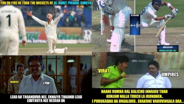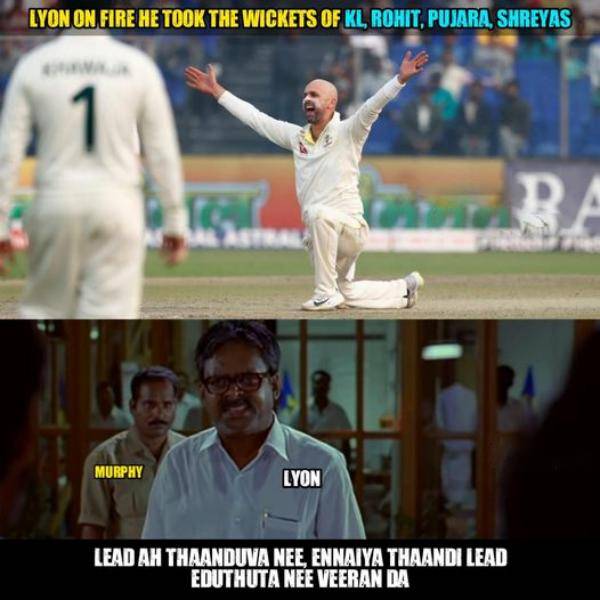 அதுமட்டுமல்லாமல் இந்திய பேட்ஸ்மேன்கள் ஆஸ்திரேலியா சுழற்பந்துவீச்சாளர்களிடம் அடுத்தடுத்து விக்கெட்டை பறிகொடுத்ததால், 139 ரன்களுக்கு 7 விக்கெட்டுகளை இழந்து இந்திய அணி திணறியது. ஸ்ரேயாஸ், விராட் கோலி என அனைத்து முக்கிய பேட்ஸ்மேன்களும் ஆட்டமிழந்தனர். அதனை குறிப்பிடும் வகையில், புதுப்பேட்டை படத்தில் வரும் அழகம் பெருமாள் பேசும், இன்னிக்கு நைட் தாண்டிருவ நீ வசனத்தை, லீட் எடுத்துருவ நீ, என்னைய தாண்டி லீட் எடுத்துட்டா வீரன்டா என்ற வசனத்தை மீமாக உருவாக்கியுள்ளனர். அந்த அளவிற்கு லயன் சிறப்பாக பந்துவீசினார்.