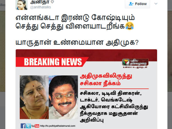 டிவியில் பிரேக்கிங் நியூஸ் வர வர நெட்டிசன்கள் அதை வைத்து அதிமுகவினரை ட்விட்டரில் கலாய்த்துக் கொண்டிருக்கிறார்கள். சில ட்வீட்டுகளை பார்த்தால் சம்பந்தப்பட்டவர்களுக்கே குபீர்னு சிரிப்பு வந்துவிடும்.