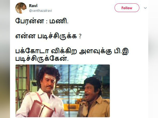 இவர் ''புதிதாக பக்கோடா கடை திறக்க என்ன வழிமுறை'' என்று வசூல் ராஜா எம்பிபிஎஸ் படத்தில் கேட்பது போல கேட்டு இருக்கிறார்.