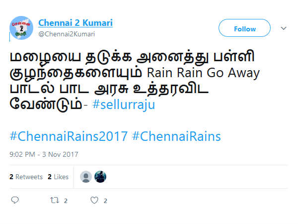மழையை தடுக்க அனைத்து பள்ளி குழந்தைகளையும் Rain Rain Go Away பாட உத்தரவிட வேண்டும்! #ChennaiRains2017