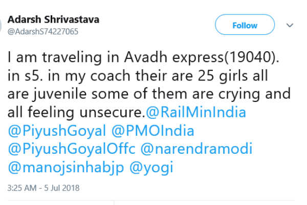 ரயில்வே அமைச்சருக்கான ட்விட்டர் ஐடி, அத்துறை அமைச்சரான பியூஷ் கோயலின் தனிப்பட்ட ஐடி, பிரதமர் மோடியின் ட்விட்டர் ஐடி, ரயில்வே இணை அமைச்சர் மனோஜ் சின்கா உள்ளிட்டோரை மென்ஷன் செய்து, இந்த தகவலை தெரிவித்துள்ளார். "நான் அவாத் எக்ஸ்பிரஸ் ரயிலில் எஸ் 5வது கோச்சில் பயணித்துக்கொண்டுள்ளேன். இந்த கோச்சில் சுமார் 25 சிறுமிகள் உள்ளனர். அனைவருமே பாதுகாப்பற்ற சூழலில் உள்ளதாக தெரிகிறது. சிலர் அழுது கொண்டுள்ளனர்" என்று குறிப்பிட்டுள்ளார்.