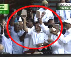 கடந்த ஜூலை மாதம் 22ம் தேதி லோக்சபாவில் நம்பிக்கை வாக்கு கோரப்பட்டது. அதன் மீதான விவாதம் அனல் பறக்க நடந்து கொண்டிருந்தது. அப்போது பாஜக எம்.பிக்கள் அசோக் அர்கால், பகன் சிங் குலஸ்தே, மகாவீர் பகோரா ஆகியோர் ரூ. 3 கோடி பணத்தைக் கொண்டு வந்து சபாநாயகர் இருக்கை முன்பு கட்டுக் கட்டாக கொட்டினர். இதனால் நாடே பெரும் அதிர்ச்சியில் ஆழ்ந்தது.