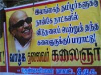 அதில், இலங்கைத் தமிழர்களுக்கு நான்கே நாட்களில் விடுதலைப் பெற்றுத் தந்த கலைஞருக்குப் பாராட்டு, வாழ்க தலைவர் கலைஞர் என்ற வாசகங்கள் இடம் பெற்றுள்ளன.