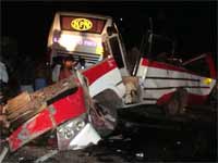 கண்ணிமைக்கும் நேரத்தில் பஸ்சும், வேனும் நேருக்கு நேர் மோதின. இதில் வேன் பகுதி நொறுங்கி முற்றிலும் உருத் தெரியாமல் போனது. இதில் சம்பவ இடத்திலேயே 10 பேர் பலியானார்கள். ஒருவர் மருத்துவமனையில் பலியானார்.