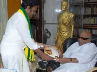 திமுக கூட்டணியில் இடம் பெற்றுள்ள மூவேந்தர் முன்னேற்ற கழகத்தின் தொகுதிப் பங்கீட்டுக் குழுவினர் இன்று திமுக தலைவர் கருணாநிதியை சந்தித்துப் பேசினர்.
