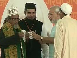 உண்ணாவிரத மேடையில் முஸ்லீம் மதத் தலைவர் வழங்கிய தொப்பியை வாங்க மறுத்த மோடி