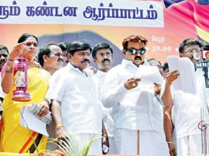 சென்னையில் கலெக்டர் அலுவலகம் அருகே பண்ருட்டி ராமச்சந்திரன் தலைமையில் தேமுதிகவினர் இன்று ஆர்ப்பாட்டம் நடத்தினர்.
