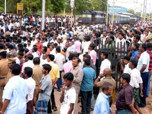 அவர்கள் வருவதைப் பார்த்ததும் போலீசார் ரயில் நிலையத்தின் வாயிலை பூட்டினர். இதனால் போராட்டக்காரர்கள் சுவர் ஏறி குதித்து தண்டவாளத்தில் அமர்ந்து போராட்டம் நடத்தினர். அப்போது அந்த ரயில் நிலையத்தில் இருந்து கிளம்ப தயாராக இருந்த மைசூர் எக்ஸபிரஸ், முத்துநகர் விரைவு ரயில், நெல்லை பயணிகள் ரயில் ஆகியவற்றை அவர்கள் சிறைபிடித்து அவற்றின் மீது ஏறி அமர்ந்தனர். மேலும் சிலர் ரயிலின் கண்ணாடிகளை அடித்து நொறுக்கினர்.