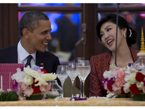 விருந்தின்போது ஒபாமா தாய்லாந்து பிரதமரிடம் கலகலப்பாக பேசி சிரித்துள்ளார். இதையடுத்து அவர் இங்லக்கிடம் வழிந்ததாக செய்திகள் வெளியாகின. மியான்மரில் ஜனநாயகத்துக்கு தாய்லாந்து அளி்த்து வரும் ஆதரவை ஒபாமா பாராட்டினார்.