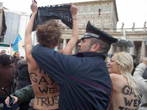 "போப் இனி இல்லை" எனவும், "குட்பை போப் பெனடிக்ட்" என்றும் இவர்கள் கோஷம் எழுப்பினர். புனித போப்பாண்டவர் பெனடிக்ட் XVI பதவி விலகுவதாக அறிவித்துள்ளதை அடுத்தே இவர்கள் இந்த அரை நிர்வாண ஆட்டத்தை பேட்டனர்.