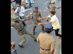 அமெரிக்கத் தீர்மானத்தை நிராகரிக்க வேண்டும் எனவும், இலங்கைப் போரில் இந்தியாவின் பங்கு குறித்தும் மாணவர்கள் முழக்கங்களை எழுப்பினார்கள். அப்போது திடீரென மாணவர்கள் மீது போலீஸ் தடியடி நடத்தத் தொடங்கியது.