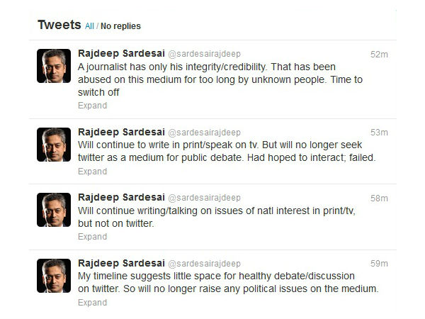 சி.என்.என். ஐபிஎன் தொலைக்காட்சி மூலமாக பரபரப்பான அரசியல் விவாதங்களை நடத்தும் ராஜ்தீப், ட்விட்டர் சமூக வலைதளத்திலும் அந்த ஆக்ரோஷம் குறையாமல் பரப்பான விவாதங்களில் ஈடுபட்டு வந்தார். இந்நிலையில் திடீரென தமது ட்விட்டர் பக்கத்தில் "A journalist has only his integrity/credibility. That has been abused on this medium for too long by unknown people. Time to switch off" என்று அறிவித்திருக்கிறார்.
