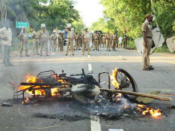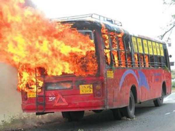 இதையடுத்து ஒரு தனியார் பஸ், 4 அரசு பஸ்கள் மற்றும் ஒரு காருக்கு தீவைக்கப்பட்டது. இதில் அந்த வாகனங்கள் எரிந்து சாம்பலாயின. நல்லவேளையாக பயணிகளை இறங்க அனுமதித்துவிட்டே அந்தக் கும்பல் தீ வைத்தது.