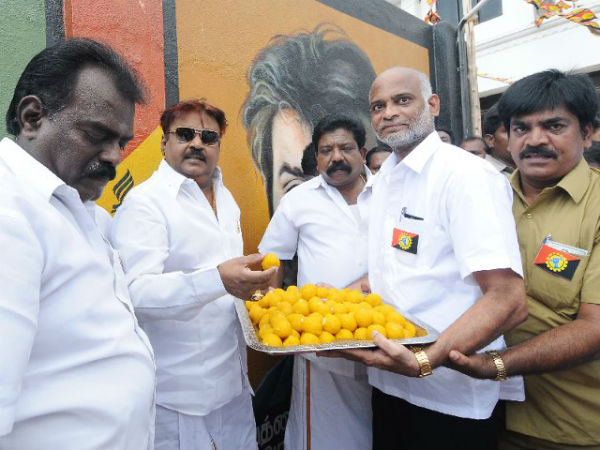 கொடியை ஏற்றி வைத்த விஜயகாந்த் தொழிலாளர்களுக்கு இனிப்பு வழங்கினார்.