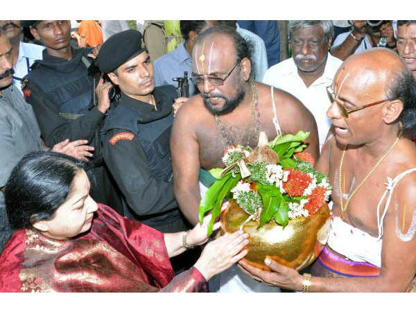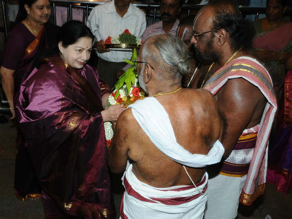 ஸ்ரீரங்கம் ரங்கா கோபுர வாசலில் ஜெயலலிதாவுக்கு பூரண கும்ப மரியாதை வழங்கப்பட்டது. ரங்கநாத பட்டர் மற்றும் நந்து பட்டர் ஆகியோர் பூரண கும்ப மரியாதை அளித்தனர். பின்பு பேட்டரி கார் முலம் சக்கரத்தாழ்வார், தாயார் மற்றும் மூலவர் சன்னதிக்கு சென்று சுவாமி தரிசனம் செய்தார்.