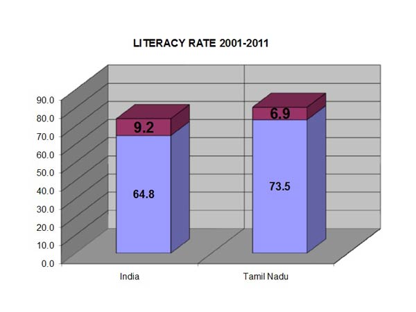 இந்தியாவின் கல்வியறிவு விகிதம் 74 சதவீதமாகவும், பெண்களின் கல்வியறிவு விகிதம் 65.5 சதவீதமாதவும் உள்ளது. இந்நிலையில் தமிழகத்தின் கல்வியறிவு விகிதம் 80.3 சதவீதமாகவும், பெண்களின் கல்வியறிவு விகிதம் 73.9 ஆகவும் உள்ளது.