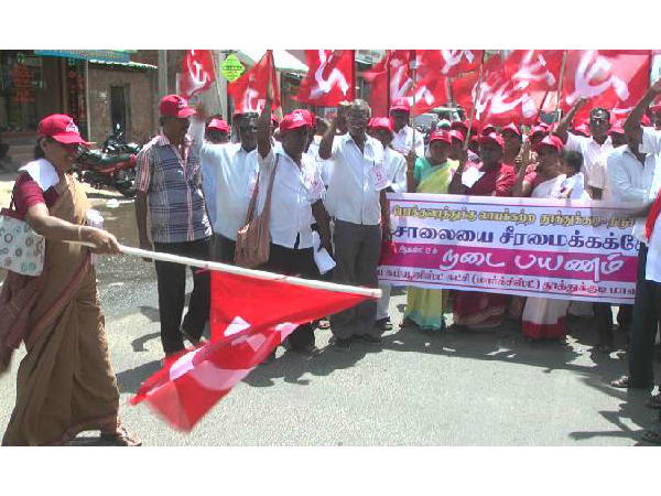 தூத்துக்குடி - திருச்செந்தூர் சாலையை சீரமைக்க்க கோரி சிபிஎம் நடைப்பயணம்
