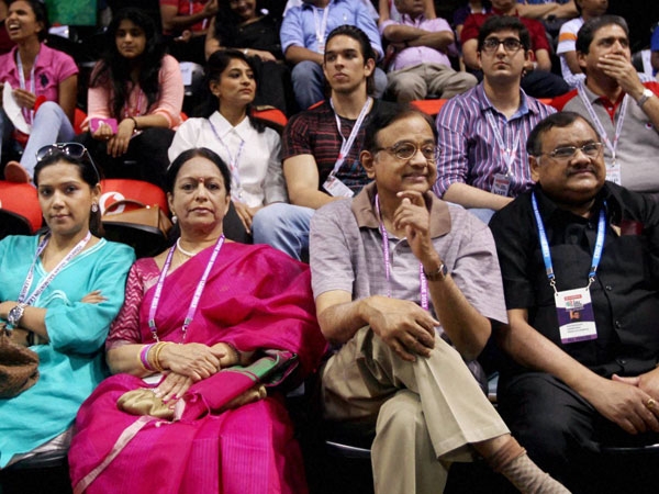 டெல்லியில் நடந்த இந்திய பேட்மிட்டன் லீக் போட்டிகளை தனது மனைவி நளினியுடன் கண்டுகழித்த மத்திய நிதியமைச்சர் ப.சிதம்பரம்
