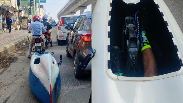 இத்தகைய பரபரப்பு மிக்க பெங்களூரு சாலையில் தனித்துவமான ஒரு வாகனம் ஒன்று சென்று கொண்டிருந்தது. ஒரே ஒருவர் மட்டுமே அமர்ந்து செல்லும் வகையில் வடிவமைக்கப்பட்ட அந்த வாகனம் சாலையில் சக பேருந்து மற்றும் கார்களுடன் போட்டி போட்டுக் கொண்டு சென்றது. வித்தியாசமான இந்த வாகனத்தை வாகன ஓட்டிகள் பலரும் கண் சிமிட்டாமல் பார்த்துக் கொண்டு இருந்தனர்.