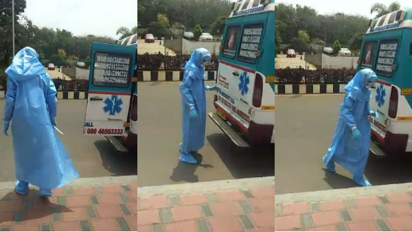 அந்த ஆம்புலன்ஸ், எம்.எஸ்.ராமையா என்ற தனியார் மருத்துவமனைக்கு சொந்தமானது. இது பெங்களூரில் யஸ்வந்தபுரம் என்ற, பகுதியில் அமைந்துள்ளது. ஆம்புலன்ஸ் ஊழியர் உடலை முழுக்க மறைக்கும் ஆடையை அணிந்தபடி, முகக் கவசம் அணிந்து வாகனம் ஓட்டிச் செல்கிறார்.