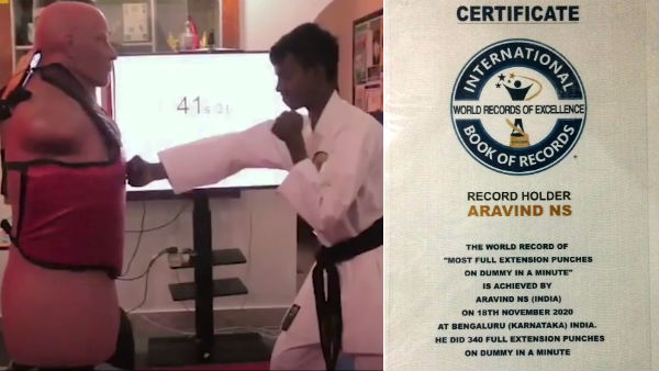கராத்தே வீரர் அரவிந்த், ஒரு நிமிடத்தில் டம்மியை 375 முறை குத்தி சாதனை படைத்துள்ளார். மின்னல் வேகத்தில் கைளை ஆக்ரோஷமாக குத்தும் வீடியோவும் வெளியாகி உள்ளது