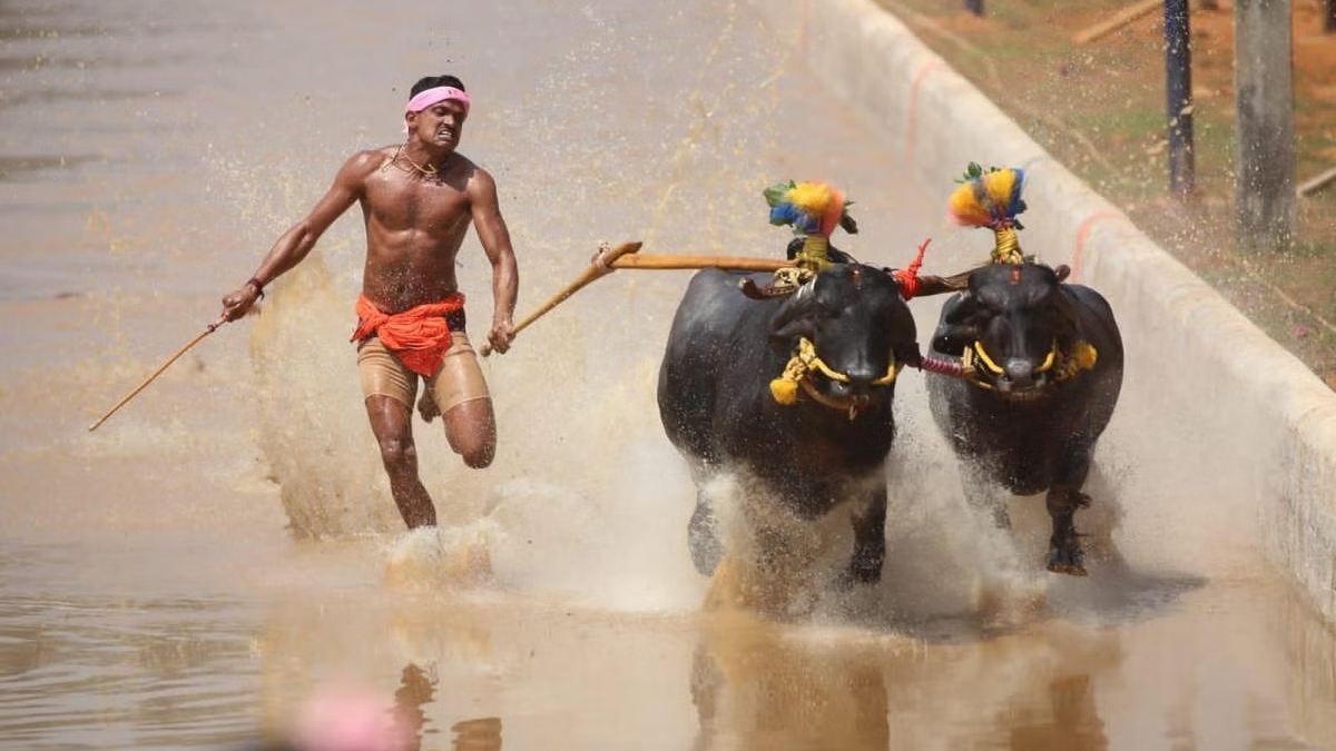 கம்பாலா என்றால் என்ன: கம்பாலா என்பது கர்நாடகாவில் கடலோர பகுதிகளில் பிரபலமாக உள்ள ஒரு விளையாட்டாகும். அங்கே குளிர்காலத்தில் விவசாயிகள் தங்கள் நெல் பயிர்களை அறுவடை செய்யும் போது நடத்தப்படும் எருமை பந்தயமே கம்பாலா என்று அழைக்கப்படும். இந்த பந்தயம் மண் மற்றும் தண்ணீரை கொண்ட டிராக்குகளில் நடக்கும். ஒரு நேரத்தில் இரண்டு டீம்கள் களமிறங்கும் ஒவ்வொரு ஜோடி எருமை மாடுகளும் அவற்றைக் கட்டுப்படுத்தி ஓட்ட 'கம்பாலா ரன்னர்' ஒருவரும் உடன் இருப்பார்.