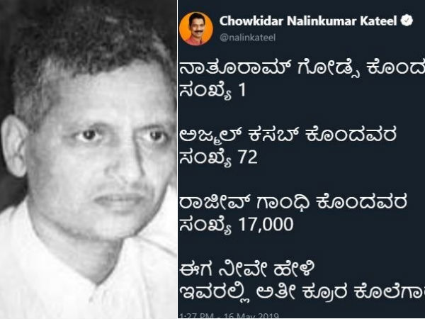 அவர் கூறுகையில், நாதுராம் கோட்சே, கொன்றவர் எண்ணிக்கை 1 மட்டுமே. தீவிரவாதி அஜ்மல் கசாப் கொலை செய்தவர்கள் எண்ணிக்கை 72. ராஜீவ்காந்தி கொலை செய்தவர்கள் எண்ணிக்கை 17 ஆயிரம். இப்போது நீங்களே சொல்லுங்கள். இவர்களில் மிக மோசமான கொலைகாரர் யார்? இவ்வாறு ட்வீட்டில் நளின் குமார் கட்டீல், கேள்வி எழுப்பியுள்ளார்.