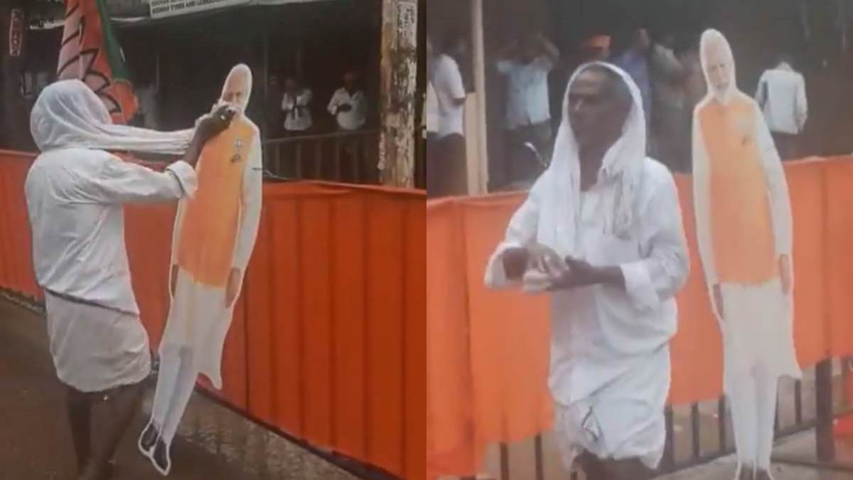 அதாவது மழையில் நனையாமல் இருக்க முதியவர் ஒருவர் தனது தலையில் துண்டு அணிந்திருந்தார். இந்த நபர் தான் தனது தலையில் இருந்த துண்டை எடுத்து சாலையில் வரிசையாக மழைநீரில் நனைந்து இருந்த பிரதமர் மோடியின் கட்அவுட்டுகளை துடைத்தார். கண்கள் கலங்கிய நிலையில் கட்அவுட்டை துடைத்துவிட்டு துண்டில் இருந்த தண்ணீரை பிழிந்தபடி முதியவர் சென்றார்.