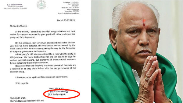 பாஜக லெட்டர் பேடிலும் தனது ஸ்பெல்லிங்கை எடியூரப்பா மாற்றிக் கொண்டார். அமித்ஷாவுக்கு எழுதிய கடிதத்திலும் இவ்வாறே பெயரை பயன்படுத்தியுள்ளார். இதுகுறித்து கட்சியின் மூத்த தலைவர்கள் கூறுகையில் Yeddyurappa என்ற ஸ்பெல்லிங் அவருக்கு அதிர்ஷ்டத்தை கொடுக்கவில்லை. மூன்று முறை முதல்வராக இருந்தபோது அவர் ஒரு முறை கூட தனது பதவிக்காலத்தை முழுவதுமாக பூர்த்தி செய்யவில்லை. எனவே ஜோதிடரை அணுகி ஒய்-க்கு பதில் ஐ-யும் ஒரு "டி" கட் செய்தும் கொண்டுள்ளார் என்றனர் தலைவர்கள்.